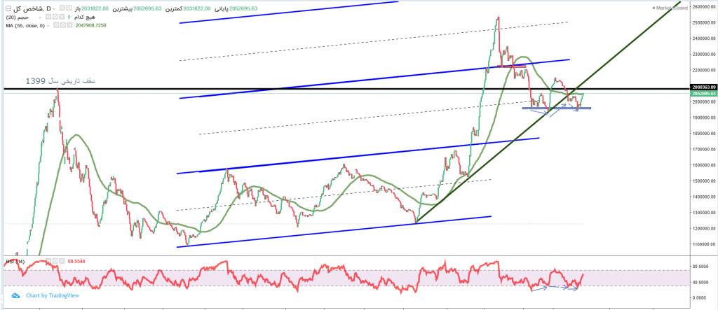 این در حالی است که شاخص به همراه اندیکاتور RSI در کف احتمالی خود یک واگرایی ایجاد کردهاند که این واگرایی در سه مرحله اتفاق افتاده است که این موضوع برای اهالی فنی بازار یک سیگنال محسوب میشود و با تغییر و شکست مقاومت هارمونیک ۵۵ روزه شاخص کل روبهبالا که احتمالاً برای روز آینده باشد. شاخص کل از مسیر فرسایشی خارج شده است و به مسیر صعودی گام خواهد گذاشت.
